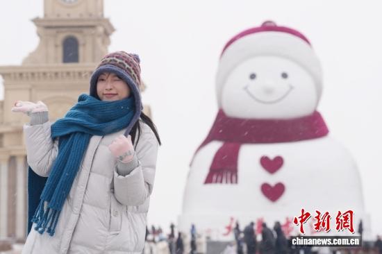 12月19日,黑龙江省哈尔滨市道里区群力音乐公园,一名游客在雪中打卡“网红大雪人”。中新社记者 张祥毅 摄