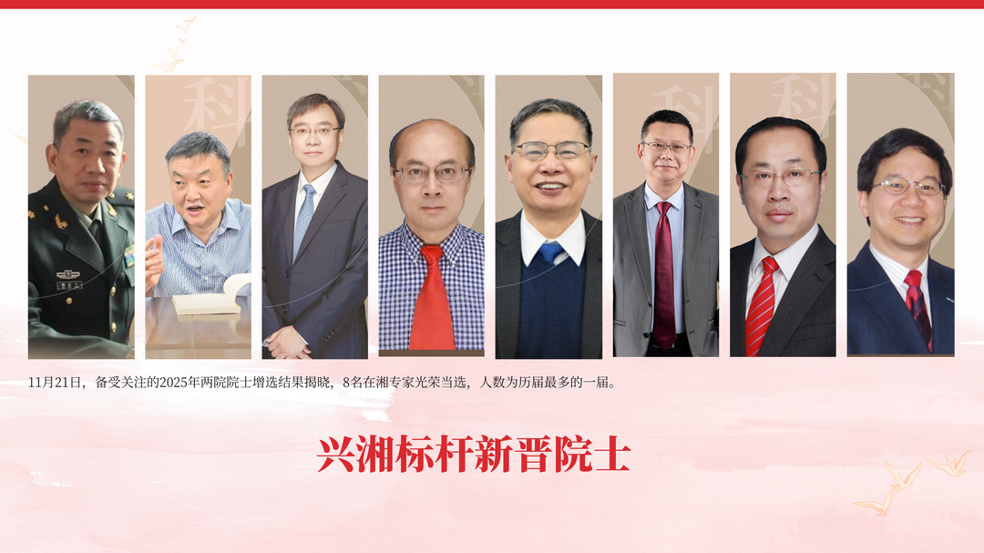 11月21日,备受关注的2025年两院院士增选结果揭晓,8名在湘专家光荣当选,人数为历届最多的一届。其中,中国人民解放军国防科技大学教授胡德文、湖南大学教授李树涛当选中国科学院院士;中南大学教授李夕兵、中南大学教授余志武当选中国工程院院士;湖南大学土木工程学院教授、博士研究生导师史才军,岳麓山实验室研究员、湖南文理学院合成生物产业研究院名誉院长张友明当选中国工程院外籍院士。这是我省高层次创新型人才队伍建设取得的又一重大成就。