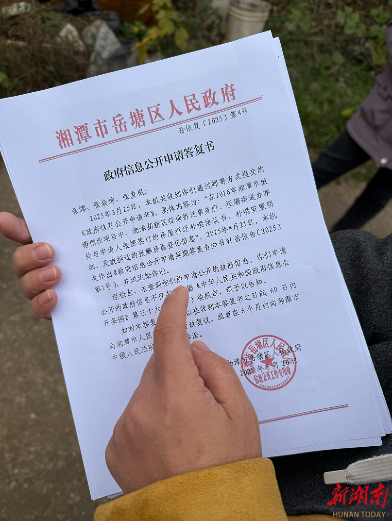 “根本没这回事!”张焱坤向记者出示了两份关键文件:岳塘区政府2025年5月20日出具的《政府信息公开申请答复书》显示,经检索,2016年板塘棚改项目中,未查到张娜的房屋拆迁补偿协议及相关登记信息;板塘街道5月26日的答复书则明确,2006年张娜所在户户主为其父张友根,张娜未单独立户,也未检索到其作为户主的建房审批记录。